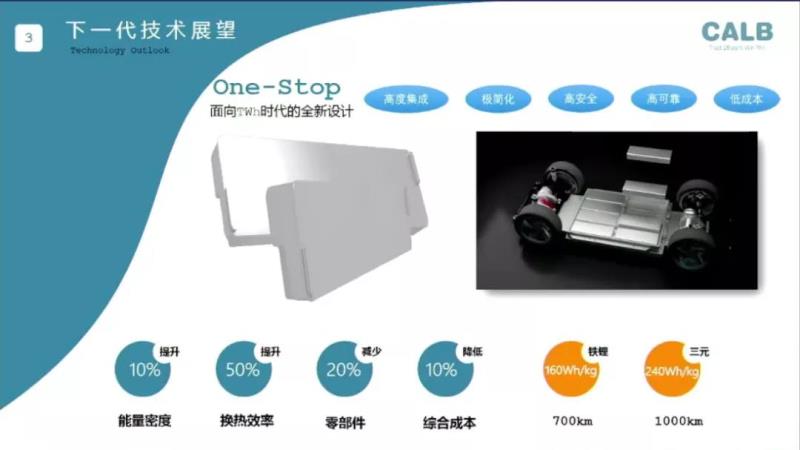 謝秋介紹說,One-Stop可以在體系不變的前提下,能量密度大概能提升10%,包含零部件可以減少20%。在相同的空間內(nèi),可以由三元變成鐵鋰,因為體積能量密度更高,鐵鋰支持700公里,電池包的能量密度能做到160Wh/kg;做三元的話,里程能支撐1000公里,電池包的能量密度達(dá)到240GWh/kg。