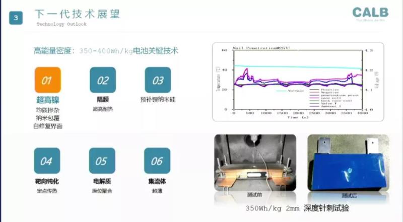 中航鋰電也在開發(fā)9系材料超高鎳材料,以及預(yù)補(bǔ)鋰、納米硅等關(guān)鍵技術(shù)。據(jù)謝秋介紹,中航鋰電現(xiàn)在做出來的成品,按照淺刺的標(biāo)準(zhǔn),一毫米的鋼針刺兩毫米深度,可以通過試驗,電池包表現(xiàn)為電壓降低。