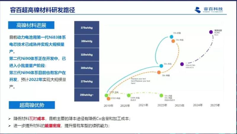 黃學(xué)杰提到的第二條降鈷路線是升鎳。為了提高容量,把鎳的容量增加,正極材料的能量可以從160mAh/g提高到180mAh/g,進(jìn)而繼續(xù)提升到200mAh/g。