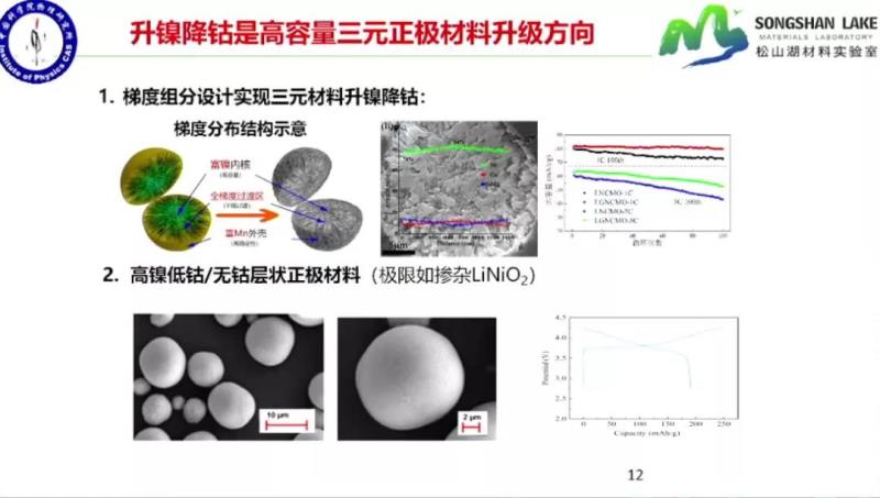因此,黃學(xué)杰認(rèn)為,三元電池降鈷是大趨勢。降鎳和升鎳也是不同的路線,降鎳有一個辦法是把三元變成二元的鎳錳酸鋰;也有一種升鎳的辦法,做高鎳電池,讓能量更高。
