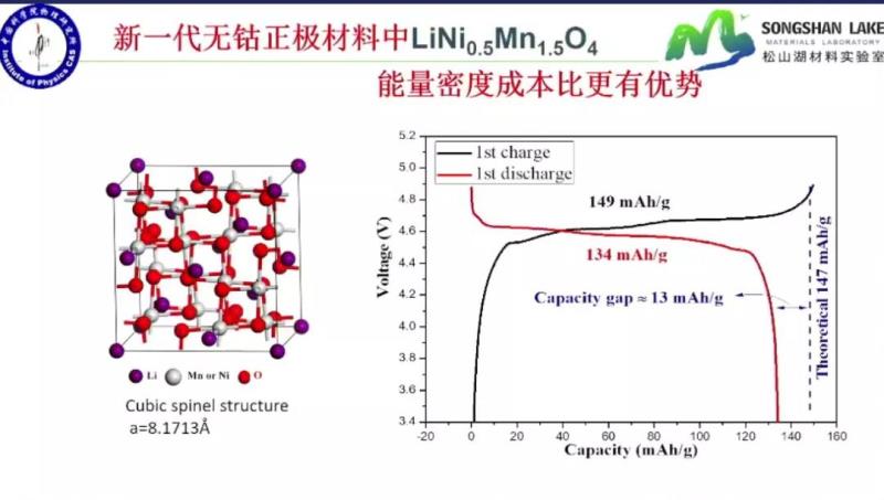 黃學(xué)杰認(rèn)為,降鎳的方向,關(guān)鍵的材料是鎳錳酸鋰,第一代材料是錳酸鋰,一樣的結(jié)構(gòu)尖晶石結(jié)構(gòu),將其中1/4的錳換成鎳后,負(fù)極搭配石墨,電壓可以在4.5V以上,“磷酸鐵鋰電池的標(biāo)準(zhǔn)電壓是3.2V,三元電池的標(biāo)準(zhǔn)電壓是3.6V,能大到4.5V,能量密度就有優(yōu)勢?!?