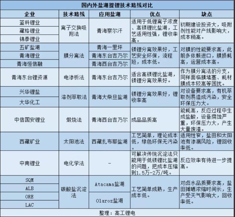 鹽湖提鋰技術路線需要因湖制宜,針對不同鹽湖特征,國內(nèi)已開發(fā)出離子交換吸附法、萃取法、膜分離法、電滲析法、煅燒法、太陽池法、電化學法等提鋰技術。具體如下: