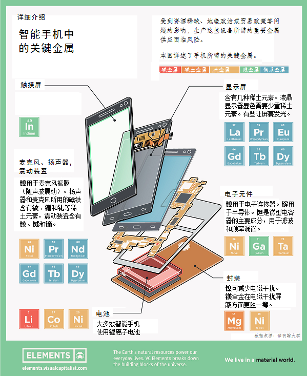 伯明翰大學(xué)的數(shù)據(jù)繪制的這張圖,詳細(xì)列舉了智能手機(jī)所包含的所有關(guān)鍵金屬。