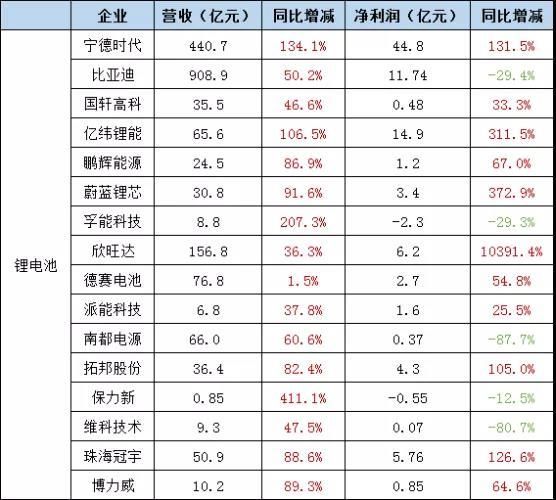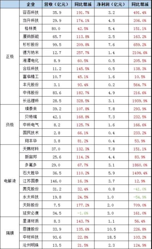 受益于新能源汽車市場需求爆發(fā),動(dòng)力電池領(lǐng)域包括寧德時(shí)代、億緯鋰能、國軒高科、鵬輝能源實(shí)現(xiàn)營收凈利大幅增長。