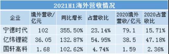 高工鋰電注意到,寧德時(shí)代、國軒高科、億緯鋰能2021年上半年境外營收出現(xiàn)翻倍式增長,同比增速在1-3.5倍,境外營收接近或已超過2020年全年。