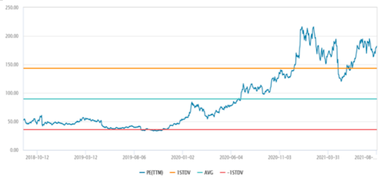 寧德時代在資本市場的表現(xiàn)十分活躍,市場信心奠定了萬億市值。截至2021年8月26日,寧德時代PE(TTM)為149倍,年初至今,平均估值為173倍,最低估值120倍,最高估值為216倍。