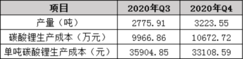 根據(jù)永興材料2020年年報顯示,2020年Q3碳酸鋰產(chǎn)線達(dá)產(chǎn)以來,至Q4碳酸鋰成本已降至3.3萬元/噸,季度產(chǎn)量提升至3223.55噸。
