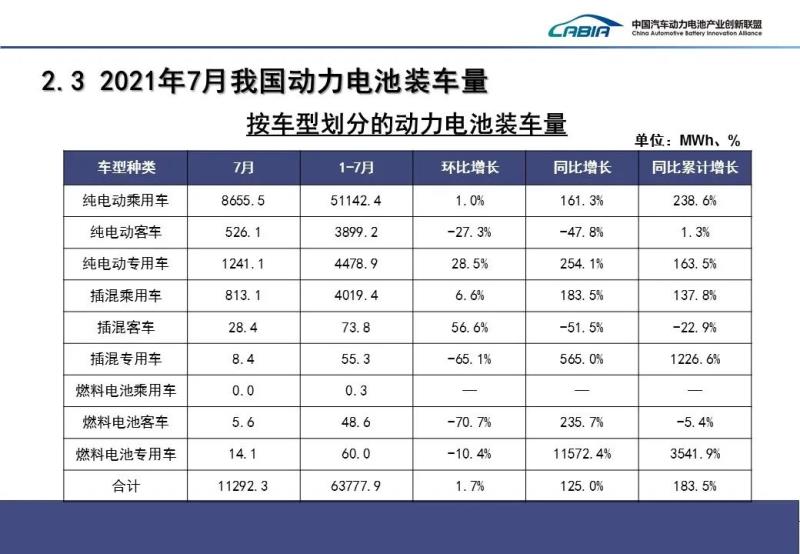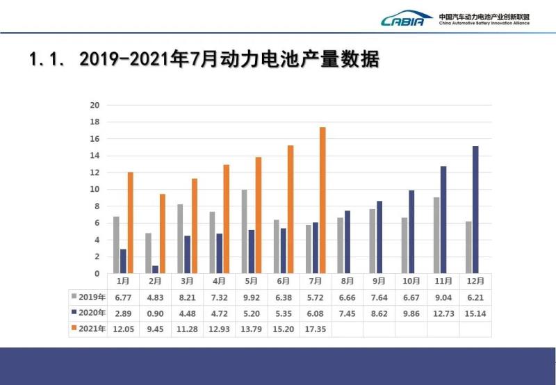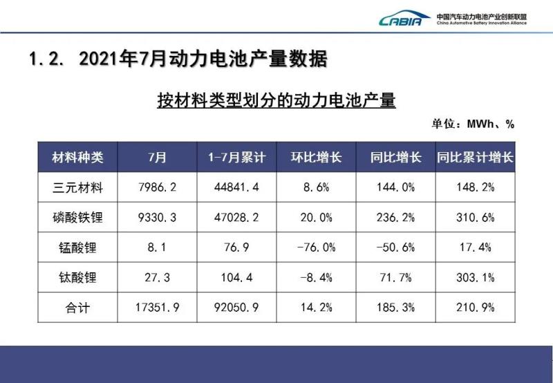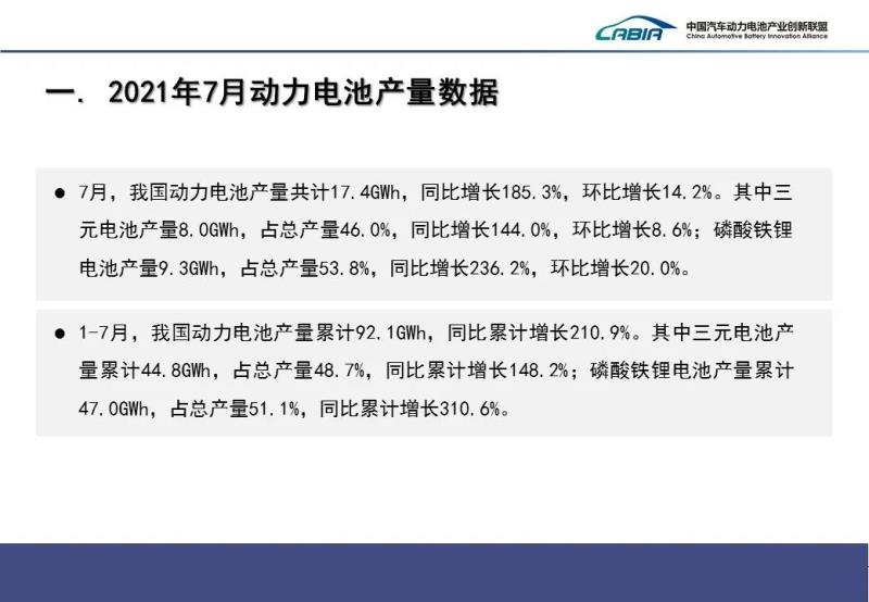 8月11日,中國(guó)汽車(chē)動(dòng)力電池產(chǎn)業(yè)創(chuàng)新聯(lián)盟發(fā)布2021年7月動(dòng)力電池月度數(shù)據(jù)。產(chǎn)量方面,2021年7月國(guó)內(nèi)動(dòng)力電池在產(chǎn)量方面共計(jì)完成17.4GWh,同比大幅增長(zhǎng)185.3%,環(huán)比增長(zhǎng)14.2%。其中三元電池產(chǎn)量8GWh,占總產(chǎn)量46%,同比增長(zhǎng)144%,環(huán)比增長(zhǎng)8.6%;磷酸鐵鋰電池產(chǎn)量9.3GWh,占總產(chǎn)量53.8%,同比增長(zhǎng)236.2%,環(huán)比增長(zhǎng)20%。