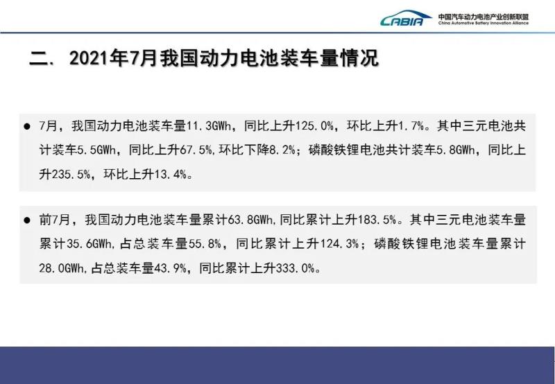 1-7月,我國(guó)動(dòng)力電池裝車(chē)量累計(jì)63.8GWh,同比累計(jì)上升183.5%。其中三元電池裝車(chē)量累計(jì)35.6GWh,占總裝車(chē)量55.8%,同比累計(jì)上升124.3%;磷酸鐵鋰電池裝車(chē)量累計(jì)28.0GWh,占總裝車(chē)量43.9%,同比累計(jì)上升333.0%。