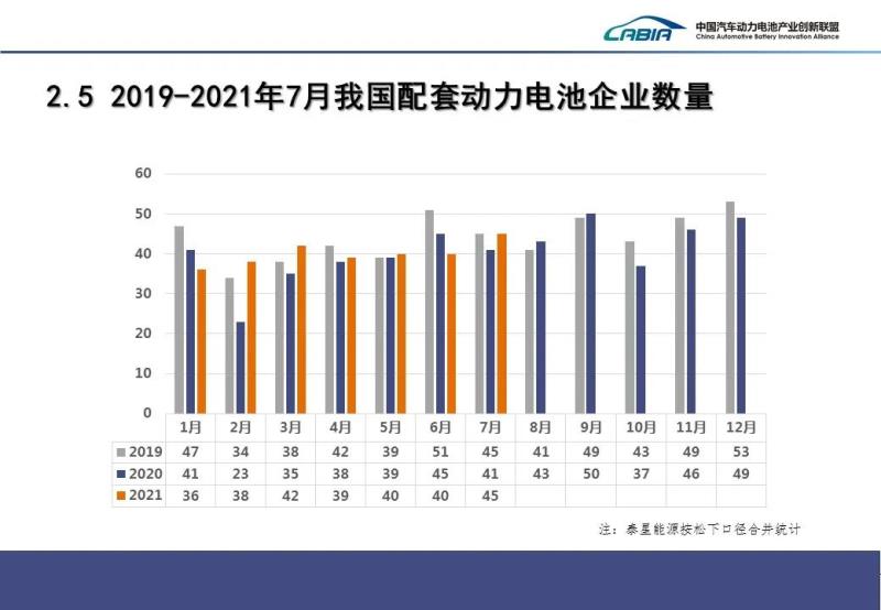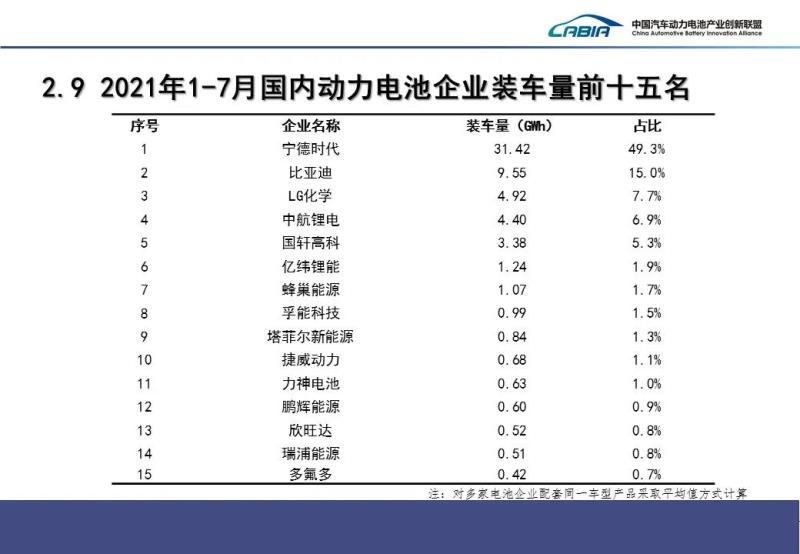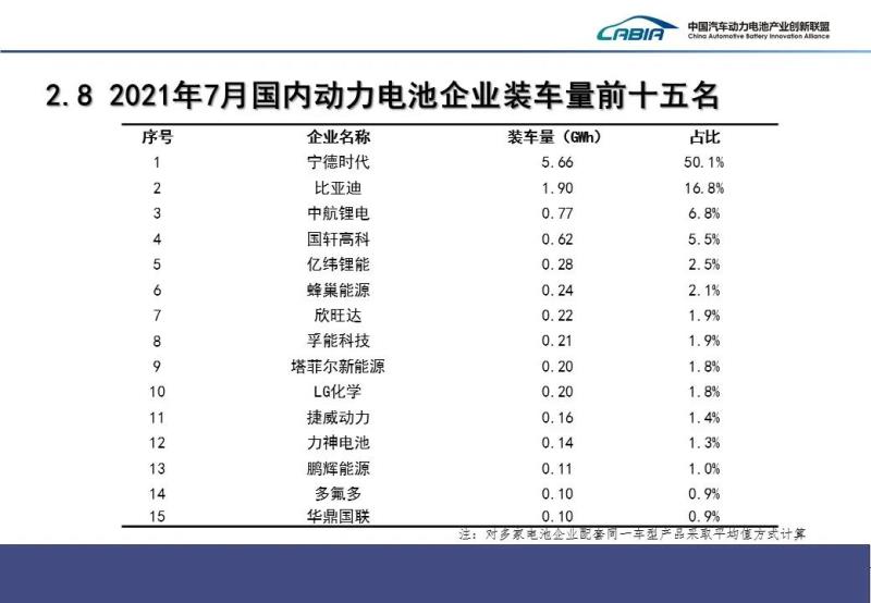 企業(yè)集中度方面,2021年7月,我國(guó)新能源汽車(chē)市場(chǎng)共計(jì)45家動(dòng)力電池企業(yè)實(shí)現(xiàn)裝車(chē)配套,較去年同期增加4家。排名前3家、前5家、前10家動(dòng)力電池企業(yè)動(dòng)力電池裝車(chē)量分別為8.3GWh、9.2GWh和10.3GWh,占總裝車(chē)量比分別為73.8%、81.8%和91.2%。