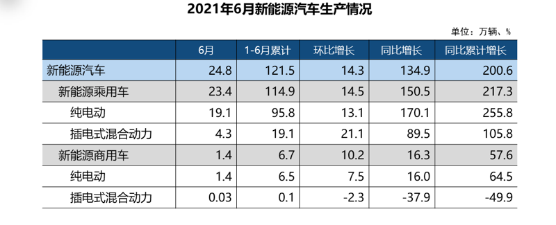 中汽協(xié)數(shù)據(jù)顯示,今年前半年,國內國內新能源汽車乘用車的生產情況為121.5萬輛,同比增長200.6%。