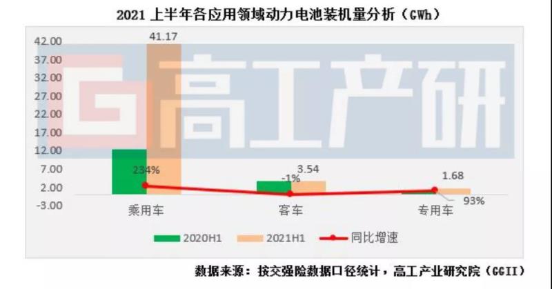 從裝機(jī)量應(yīng)用領(lǐng)域來(lái)看,上半年新能源乘用車(chē)領(lǐng)域裝機(jī)電量約41.17GWh,同比增長(zhǎng)234%,占總體的88.7%,成為拉動(dòng)動(dòng)力電池裝機(jī)量增長(zhǎng)的絕對(duì)主力。