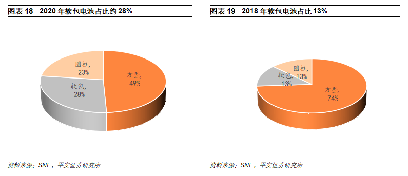 目前鋰電池的封裝技術主要有三種,即圓柱、方形和軟包。三種電池各有利弊,其中圓柱電池產(chǎn)品一致性好,方形電池成熟度較高且獲得中日韓三國全面認可,軟包電池安全性高且得到海外主機廠普遍認可。三種電池技術所對應的加工工藝不完全一樣,圓柱電池多用卷繞工藝,軟包電池多用疊片工藝,方形電池既可以用卷繞工藝,也可以用疊片工藝,目前以卷繞工藝為主。