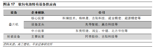 布局疊片機技術的設備商有望崛起。目前疊片機供應商包括先導智能、科瑞技術、格林晟、吉陽科技、超業(yè)精密等。隨著軟包電池占比的提升,同時越來越多的電池廠家采用疊片工藝(如比亞迪、蜂巢等),疊片機市場即將爆發(fā),布局疊片機技術的設備商有望崛起。