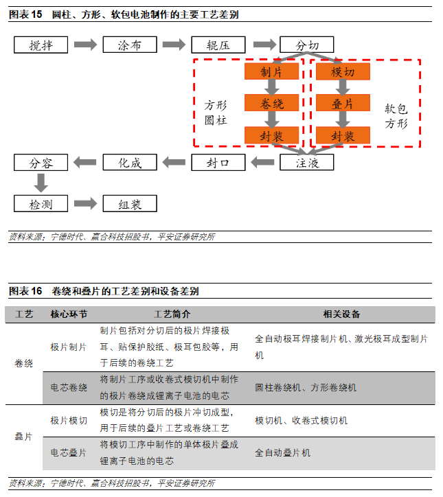 不同的工藝對應的設備也存在差別,體現(xiàn)在兩方面:一是,卷繞工藝包括極片制片和電芯卷繞兩道環(huán)節(jié),需要用到制片機和卷繞機;而疊片工藝包括極片模切和電芯疊片兩道環(huán)節(jié),需要用到模切機和疊片機。二是,卷繞工藝和疊片工藝后道的封裝工藝不一樣,其設備存在差異。