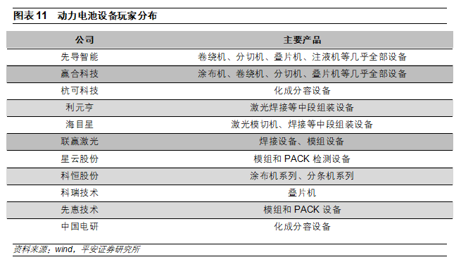 我國是全球最大的動力電池生產(chǎn)基地,動力電池設備廠家眾多。我國設備行業(yè)誕生了先導智能、贏合科技、杭可科技等龍頭企業(yè),同時還擁有利元亨、聯(lián)贏激光、海目星、中國電研等一批優(yōu)秀的二線品牌。