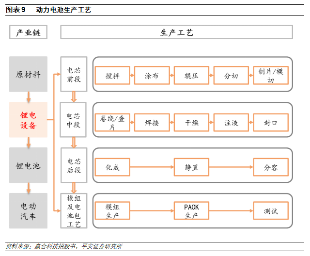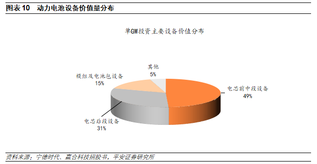 鋰電設備主要分為電芯前段、中段、后段、模組和PACK四大類。動力電池工藝流程主要包括電芯前段、電芯中段、電芯后段、模組及電池包段四大環(huán)節(jié)。其中前段的核心設備為涂布機,中段核心設備為卷繞機/疊片機,后段的核心設備為化成分容設備。設備價值分布方面,電芯前中段、電芯后段、模組及電池包、其他占比分別為49%、31%、15%和5%。