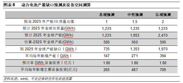 中性預期下,未來5年鋰電設備年均市場規(guī)模達487億元。由于動力電池產(chǎn)能處于快速擴張期,產(chǎn)能擴張快于出貨量數(shù)據(jù),產(chǎn)能/出貨量通常大于1。我們按照2025年產(chǎn)能/出貨量為1(悲觀預期)、1.5(中性預期)、2(樂觀預期)來測算,則2025年全球動力電池產(chǎn)能分別達到1235GWh、1853GWh、2470GWh.2020年,全球動力電池產(chǎn)能預估為500GWh,則三種預期下,2020年到2025年全球動力電池產(chǎn)能缺口分別為735GWh、1353GWh、1970GWh,年均新增產(chǎn)能為147GWh、271GWh、394GWh。按照每GWh設備投資為1.8億元測算,則三種預期下,年均設備市場空間分別為265億元、487億元、709億元。鋰電設備景氣度具有可持續(xù)性。