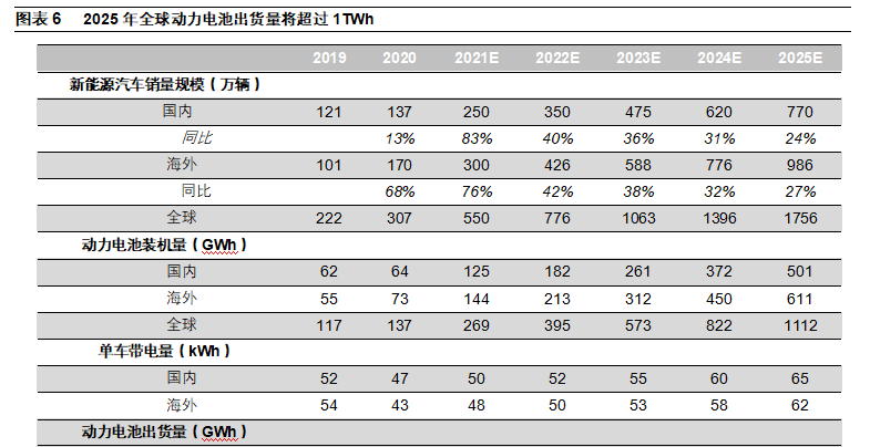 動力電池將迎來TWh時代。根據(jù)平安證券電力設備與新能源組預測數(shù)據(jù),2021年全球新能源汽車銷量將達到550萬輛,同比增長79%。其中,國內(nèi)銷量預計達到250萬輛,同比增長83%。預計到2025年,國內(nèi)、國外新能源汽車銷量分別達到770萬輛、986萬輛,按照國內(nèi)單車帶電量65kWh,國外單車帶電量62kWh測算,預計2025年國內(nèi)和國外裝機量分別達到501GWh和611WGh,合計達到1112GWh。我們按照裝機量/出貨量為90%估算,到2025年,全球動力電池出貨量將達到1235GWh。動力電池將進入TWh時代。