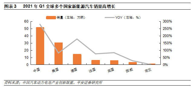 不僅僅是國內(nèi)銷量超預期,海外新能源汽車銷售同樣景氣。2021年Q1,美國、德國、法國、英國、挪威等國新能源汽車銷量分別為30.37萬輛、14.27萬輛、6.19萬輛、5.83萬輛、2.97萬輛,同比增速達81%、178%、75%、83%、27%。全球新能源汽車銷量同樣在加速。