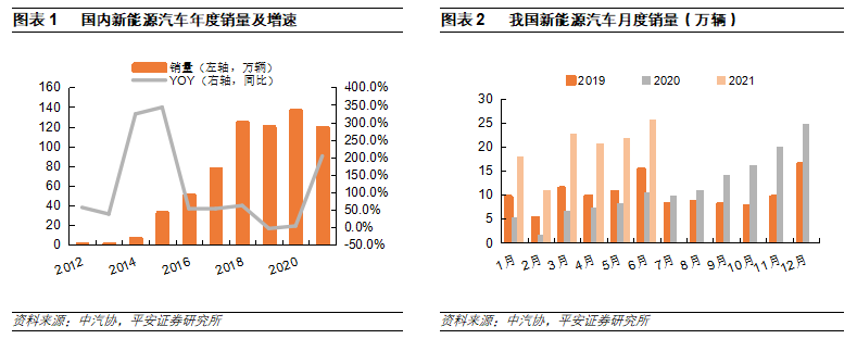 2021年新能源汽車銷量爆發(fā)增長。2021年H1,國內(nèi)新能源汽車總銷量達119萬輛,同比增長204%,相比2019年H1也上漲了91%,新能源汽車銷量數(shù)據(jù)超出市場預期。從月銷量數(shù)量來看,2021年1-6月,我國新能源汽車單月銷量分別為17.9萬輛、11.0萬輛、22.6萬輛、20.6萬輛、21.7萬輛、25.6萬輛,同比增速均超過100%。