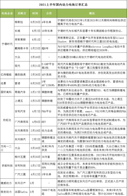 2021年,特斯拉、雷諾、廣汽三菱、大眾、長城等國內(nèi)外大廠動力電池需求確定及龐大,相繼與頭部動力電池企業(yè)簽訂長單鎖定優(yōu)質(zhì)產(chǎn)能。如特斯拉4年長單綁定寧德時(shí)代,雷諾也與遠(yuǎn)景動力簽訂5年訂單,長城汽車更是直接與寧德時(shí)代簽訂長達(dá)10年的訂單。