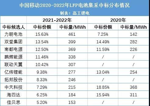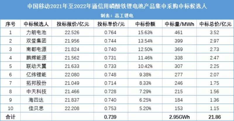 7月13日,中國移動公示2021年至2022年通信用磷酸鐵鋰電池產(chǎn)品集中采購中標候選人,力朗電池、雙登集團、南都電源、鵬輝能源、聯(lián)動天翼、億緯鋰能、拓邦股份、中天科技、海四達、佳貝思這10家企業(yè)中標。