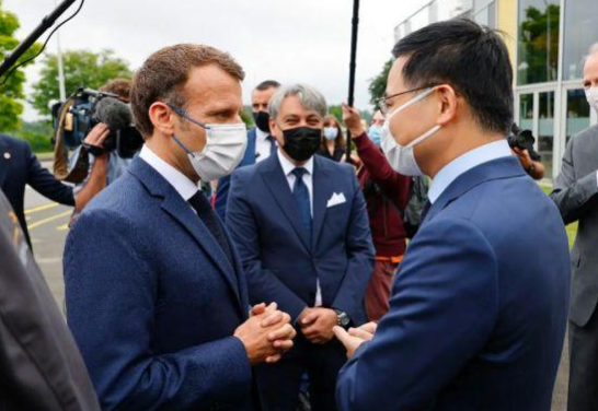 ▲馬克龍總統(tǒng)(左)與遠(yuǎn)景科技集團(tuán)CEO張雷(右)親切交談。
