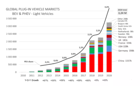 電動汽車的銷量數(shù)據(jù)則更加直觀。至2020年,中國電動汽車銷量占比全球達41.2%,歐洲主要國家占比達37.7%,美國丟失單一新能源汽車市場TOP2,占比僅10.1%。