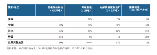 報告指出,中國在動力電池四大核心材料產(chǎn)能制造上已經(jīng)擁有超強的領先優(yōu)勢。其中,在正極材料制造占比達42%,負極材料占比達65%,電解液占比達65%,隔膜制造占比達43%。