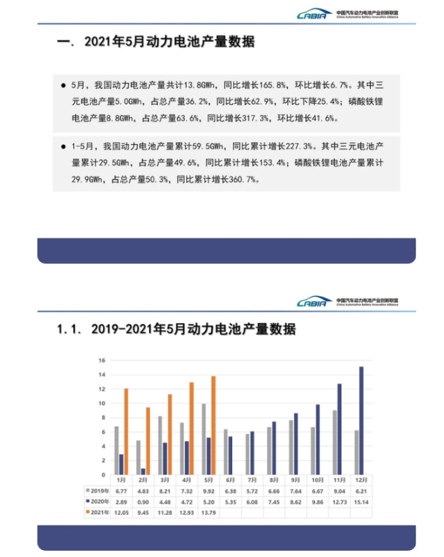 產(chǎn)量方面,2021年5月,我國(guó)動(dòng)力電池產(chǎn)量共計(jì)13.8GWh,同比增長(zhǎng)165.8%,環(huán)比增長(zhǎng)6.7%。其中三元電池產(chǎn)量5.0GWh,占總產(chǎn)量36.2%,同比增長(zhǎng)62.9%,環(huán)比下降25.4%;磷酸鐵鋰電池產(chǎn)量8.8GWh,占總產(chǎn)量63.6%,同比增長(zhǎng)317.3%,環(huán)比增長(zhǎng)41.6%。1-5月,我國(guó)動(dòng)力電池產(chǎn)量累計(jì)59.5GWh,同比累計(jì)增長(zhǎng)227.3%。其中三元電池產(chǎn)量累計(jì)29.5GWh,占總產(chǎn)量49.6%,同比累計(jì)增長(zhǎng)153.4%;磷酸鐵鋰電池產(chǎn)量累計(jì)29.9GWh,占總產(chǎn)量50.3%,同比累計(jì)增長(zhǎng)360.7%。