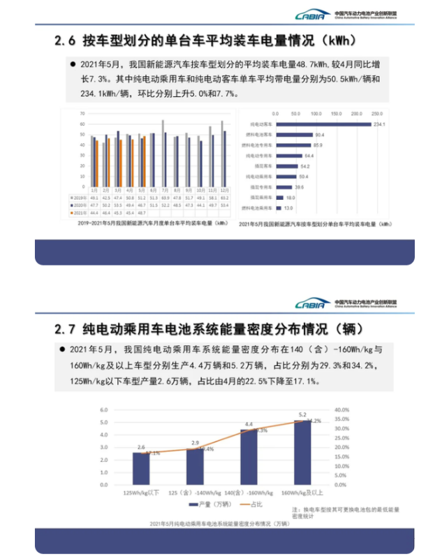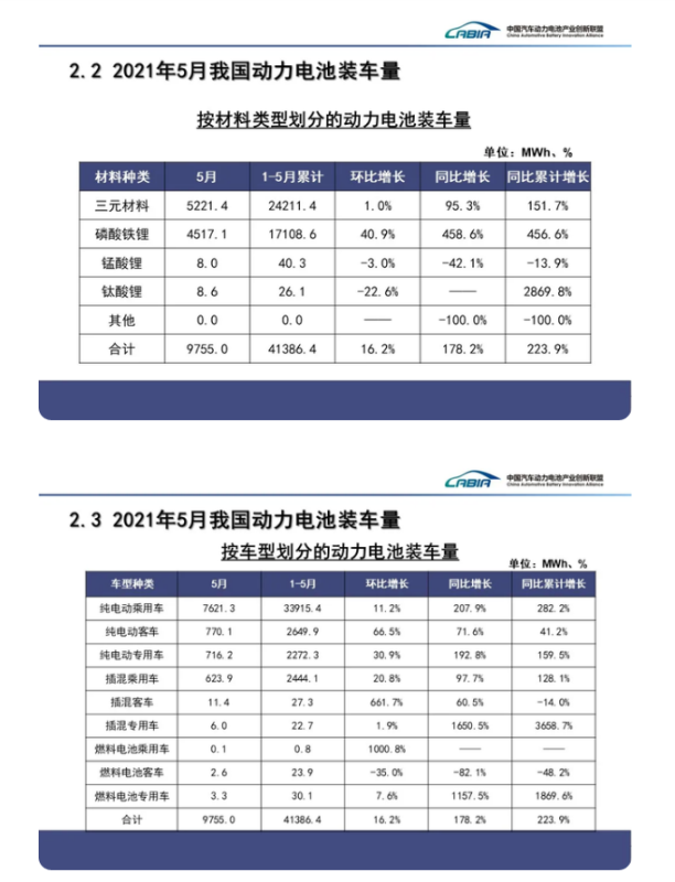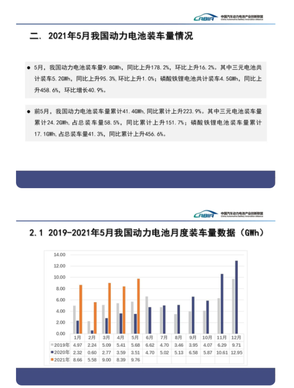 裝車量方面,2021年5月,我國(guó)動(dòng)力電池裝車量9.8GWh,同比上升178.2%,環(huán)比上升16.2%。其中三元電池共計(jì)裝車5.2GWh,同比上升95.3%,環(huán)比上升1.0%;磷酸鐵鋰電池共計(jì)裝車4.5GWh,同比上升458.6%,環(huán)比增長(zhǎng)40.9%。前5月,我國(guó)動(dòng)力電池裝車量累計(jì)41.4GWh,同比累計(jì)上升223.9%。其中三元電池裝車量累計(jì)24.2GWh,占總裝車量58.5%,同比累計(jì)上升151.7%;磷酸鐵鋰電池裝車量累計(jì)17.1GWh,占總裝車量41.3%,同比累計(jì)上升456.6%。