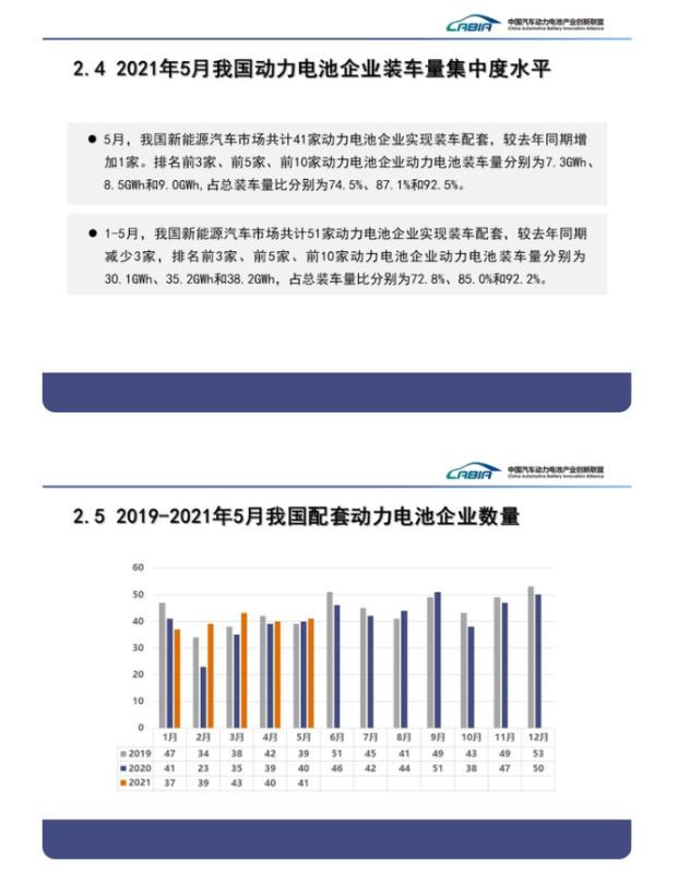 企業(yè)集中度方面,2021年5月,我國(guó)新能源汽車市場(chǎng)共計(jì)41家動(dòng)力電池企業(yè)實(shí)現(xiàn)裝車配套,較去年同期增加1家。排名前3家、前5家、前10家動(dòng)力電池企業(yè)動(dòng)力電池裝車量分別為7.3GWh、8.5GWh和9.0GWh,占總裝車量比分別為74.5%、87.1%和92.5%。前5月,我國(guó)新能源汽車市場(chǎng)共計(jì)51家動(dòng)力電池企業(yè)實(shí)現(xiàn)裝車配套,較去年同期減少3家,排名前3家、前5家、前10家動(dòng)力電池企業(yè)動(dòng)力電池裝車量分別為30.1GWh、35.2GWh和38.2GWh,占總裝車量比分別為72.8%、85.0%和92.2%。