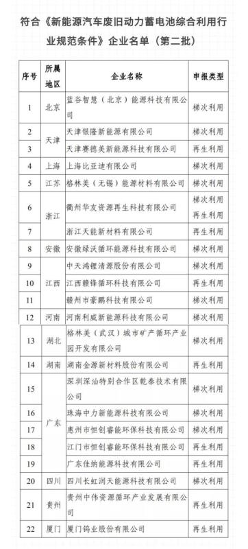 工信部于2018年7月公布第一批5家,包括華友、豪鵬科技、格林美、邦普循環(huán)、光華科技;2021年1月,工信部第二批入圍白名單的共計22家,深圳深汕特別合作區(qū)乾泰技術(shù)有限公司入列。