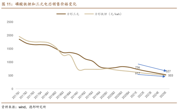 德邦證券預(yù)測,到2025年,磷酸鐵鋰和三元電芯的銷售價格差距將從20%縮窄至5%,有望實現(xiàn)三元平價。