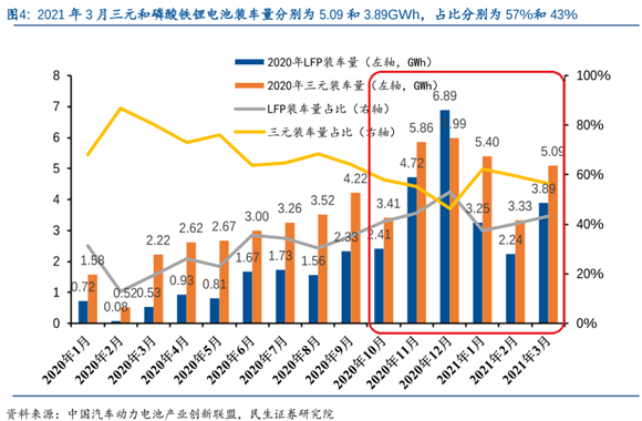 從鐵鋰和三元的裝車量占比看,兩者已經(jīng)不相上下,2021年3月,兩類電池的裝車量分別達(dá)到3.89GWh和5.09GWh,占比分別為43%和57%,兩者的剪刀口縮窄至14%。