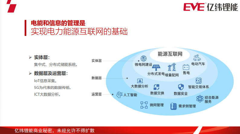 首先從實(shí)體層來講,大家都非常熟悉的集中式或者分布式的儲能系統(tǒng)、新能源汽車,都是能源互聯(lián)網(wǎng)的一些實(shí)體應(yīng)用。在數(shù)據(jù)層、運(yùn)營層,涵蓋了用能信息的采集、傳輸以及平臺的大數(shù)據(jù)分析。