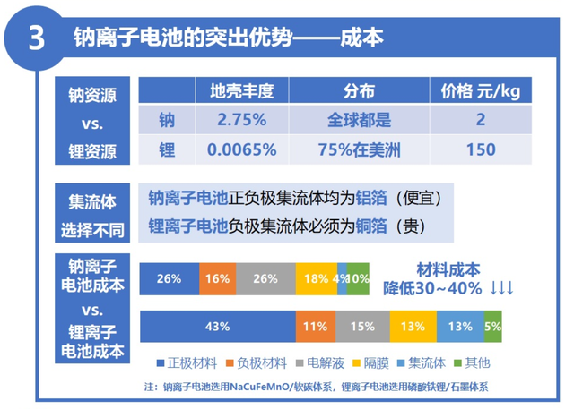 貝殼財(cái)經(jīng)記者獲悉,鈉離子電池與目前主流的鋰離子電池工作原理相同,制造工藝相似,優(yōu)勢(shì)在于成本較低,原材料資源豐富,且安全性能較高,缺陷之一在于其能量密度、循環(huán)壽命等性能指標(biāo)低于鋰離子電池,因而無(wú)法匹配車用電池續(xù)航里程的要求。