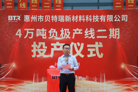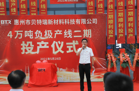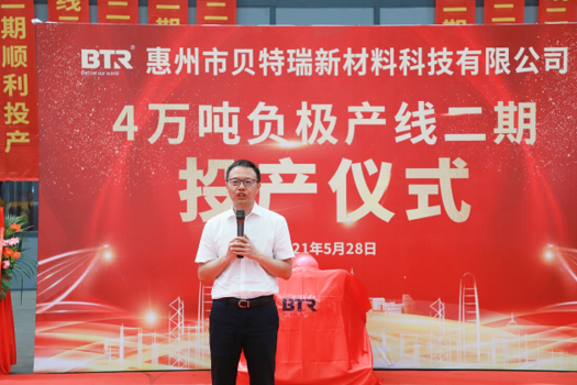 貝特瑞集團總經理任建國致辭:惠州貝特瑞4萬噸負極產線二期的順利投產,意味著惠州貝特瑞具備了年產4萬噸石墨負極的生產能力,能夠有效改善公司目前的供貨壓力。同時也提出了對惠州公司的期望和要求,特別是安全、品質和經營質量等方面。希望惠州貝特瑞迎難而上,跟上公司快速發(fā)展的步伐。