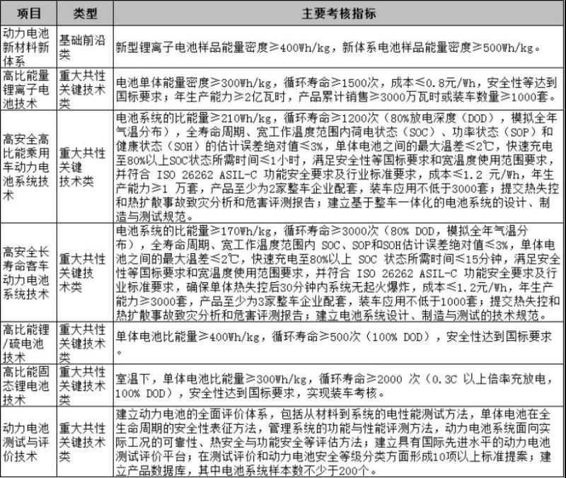其中,在能源動力方面,將重點圍繞全固態(tài)金屬鋰電池技術(shù)、車用固體氧化物燃料電池關(guān)鍵技術(shù)、高密度大容量氣氫車載儲供系統(tǒng)設(shè)計及關(guān)鍵部件研制作出支持。主要考核指標(biāo)如下: