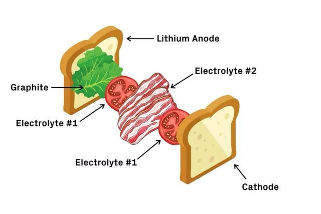 為了保護固態(tài)鋰金屬電池不受枝晶驅動的破壞,該團隊將電池分成不同的層,每層都有不同的穩(wěn)定性。它們位于作為“面包”的兩個電極之間,包括石墨涂層(生菜)、第一電解質層(番茄)、第二電解質層(培根),最后是又一層第一電解質(又是番茄)。