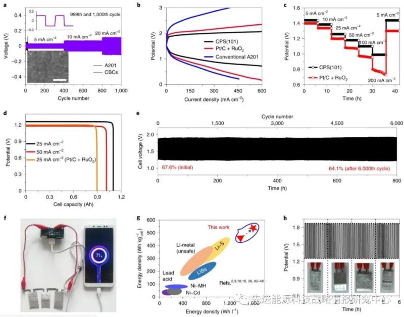 該項研究制備了新型的三維多孔正極磷硫化銅,結(jié)合高離子導(dǎo)電性、高氧還原和析氫催化活性的抗凍聚糖生物纖維素(CBC)固態(tài)電解質(zhì),組裝成高性能的軟包鋅空電池,獲得了高達(dá)460? Wh/kg放電比能量密度和6000余次長程循環(huán)穩(wěn)定性,為開發(fā)高性能長壽命的新一代非鋰儲能電池指明了新方向。相關(guān)研究成果發(fā)表在《Nature Energy》。