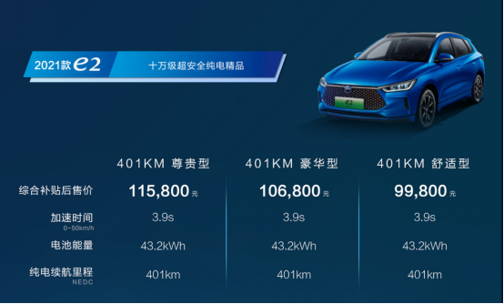 2021款e2是一款具有動感時尚設(shè)計、領(lǐng)先同級刀片電池技術(shù)、人性化智能交互多維升級的十萬級超安全純電精品之作。它搭載刀片電池,加上輕量化安全車身,全面的主被動安全配置。同時擁有401km超長巡航,百公里電耗低至10.8kWh,性能全面領(lǐng)先同級。2021款e2綜合補貼后價格為9.98萬元-11.58萬元。