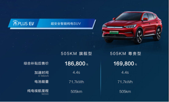 宋PLUS EV為一線都市精英而來,是一款超安全智能純電SUV。它延續(xù)了“寬體低趴”的造型風格,擁有新B級大軸距奢享空間。佩刀升級的宋PLUS EV配合全新一代智能溫控系統(tǒng),及德系豪車底盤調(diào)校,輕松突破505km續(xù)航,0到50km加速時間快至4.4秒。全系配備360°高清全景影像系統(tǒng)、全息透明影像系統(tǒng)、智能遙控駕駛、新能源專屬的移動電站、VTOL 220V電源輸出等超智能科技配置,引領(lǐng)使用價值新高度!宋PLUS EV綜合補貼后價格為16.98萬元-18.68萬元。