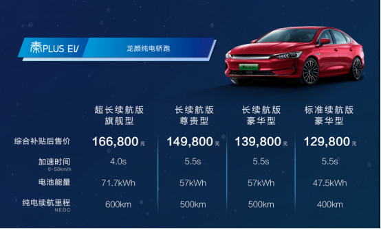 秦PLUS EV作為一款龍顏純電轎跑,延續(xù)大放異彩的EV Dragon Face設(shè)計語言,龍須飛揚、龍睛銳利。游龍躍動腰線搭配龍騰溜背造型,整體線條飽滿靈動,宛如游龍,氣勢磅礴。佩刀而來的秦PLUS EV以快和遠,成為同級車中的性能表率,同時擺脫了里程束縛和充電焦慮。0到50公里加速快至4秒,遠超同級的600km超長續(xù)航,百公里電耗低至12.9kWh。充電一次、通勤兩周。30分鐘直流快充,電量即可從30%充至80%。秦PLUS EV綜合補貼后價格為12.98萬元-16.68萬元。