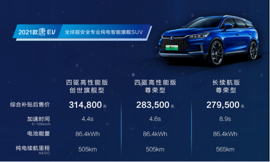 2021款唐EV除了“帶刀”升級外,還擁有“五星安全”和“三項全優(yōu)”雙重認證,是全球超安全專業(yè)純電智能旗艦SUV。2021款唐EV零百加速4.4秒,制動距離34.5m,續(xù)航里程565km,充電10分鐘可跑118km,是當之無愧的“性能猛獸”。它同時搭載更懂用戶的人機交互,更人性化的智能空間,給用戶全方位的智能領(lǐng)航。2021款唐EV此次更加推四驅(qū)高性能尊榮型,零百加速僅為4.6秒,成為首款殺入30萬內(nèi)的中大型四驅(qū)7座純電SUV,綜合補貼后價格為27.95萬元-31.48萬元。