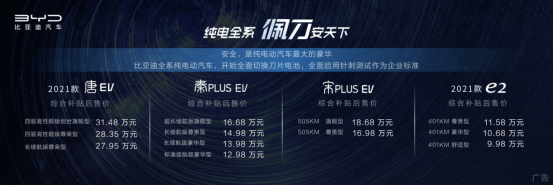刀片電池的升級測試發(fā)布的同時,佩刀而來的2021款唐EV、秦PLUS EV、宋PLUS EV及2021款e2四款新車型也同步上市發(fā)布。