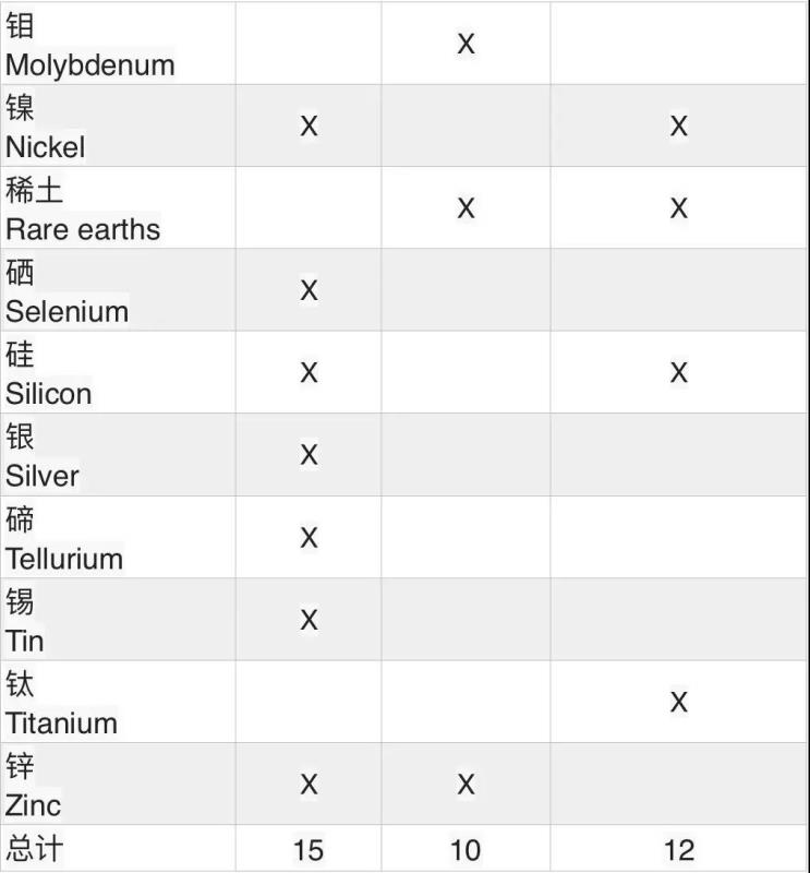 總結(jié)一下,太陽能技術(shù)對于各種金屬材料依賴較大(15種);其次是電動汽車/儲能(12種)、風(fēng)能(10種)。也就是說,太陽能、儲能相關(guān)技術(shù)對于金屬材料的依賴使得其較受地理政治(金屬材料資源分布)的影響,風(fēng)能技術(shù)受地理政治影響相對比較小。