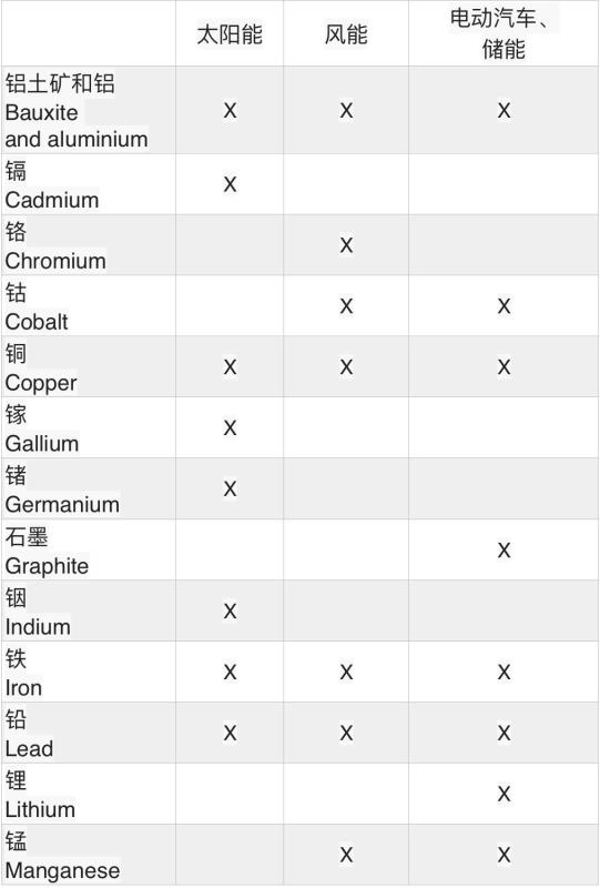 全球能源轉(zhuǎn)型地緣政治委員會(Global Commission on the Geopolitics of Energy Transformation)與國際可再生能源署(IRENA)日前發(fā)布《一個新世界:能源轉(zhuǎn)型的地理政治》(A New World: The Geopolitics of the Energy Transformation),其中轉(zhuǎn)引了一張表列出綠色能源技術(shù)所需要的各類金屬材料——