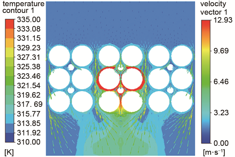 圖8 t=2504.4電芯截面溫度云圖及速度矢量